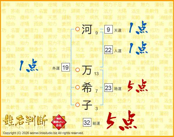 生活面を象徴する運勢です。外部から受ける影響力を表し、結婚運、家庭運や職場、環境への順応性を表します。総運から人運を引いた画数。姓や名が1文字の場合を除く。