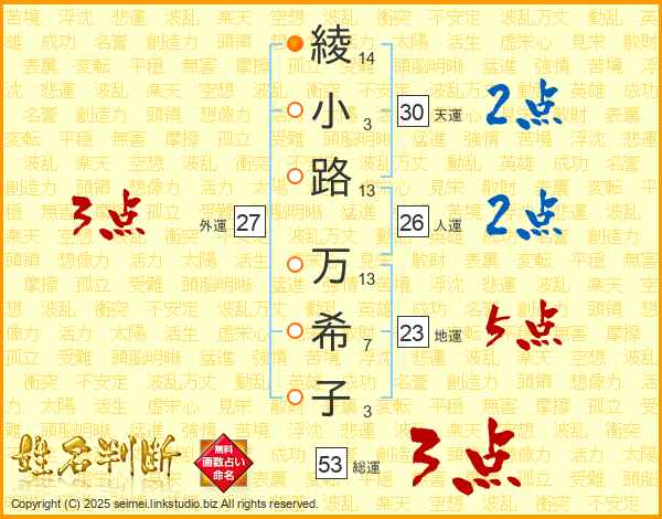 綾(14画)小(3画)路(13画) 万(13画)希(7画)子(3画)