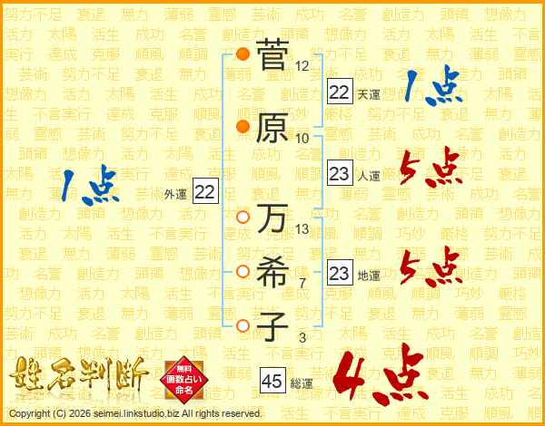 菅(12画)原(10画) 万(13画)希(7画)子(3画)