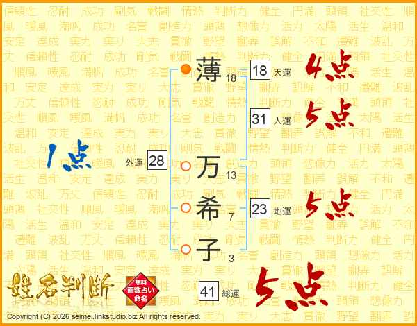 生活面を象徴する運勢です。外部から受ける影響力を表し、結婚運、家庭運や職場、環境への順応性を表します。総運から人運を引いた画数。姓や名が1文字の場合を除く。