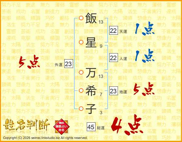 飯(13画)星(9画) 万(13画)希(7画)子(3画)