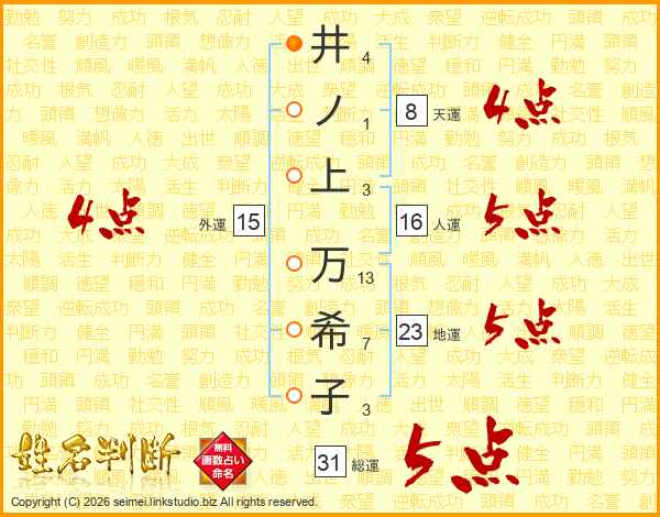 井(4画)ノ(1画)上(3画) 万(13画)希(7画)子(3画)