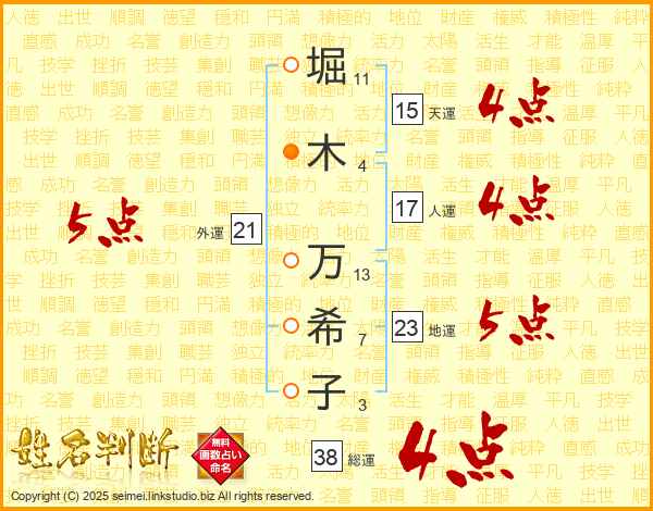 堀(11画)木(4画) 万(13画)希(7画)子(3画)