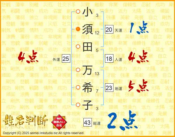 小(3画)須(12画)田(5画) 万(13画)希(7画)子(3画)