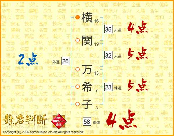 横(16画)関(19画) 万(13画)希(7画)子(3画)