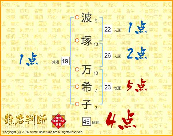 波(9画)塚(13画) 万(13画)希(7画)子(3画)