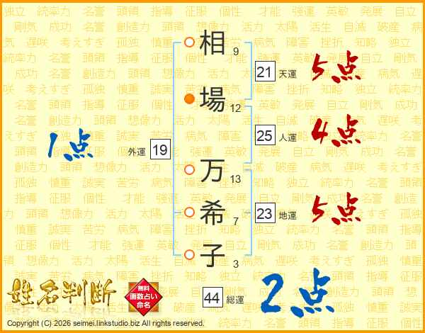 相(9画)場(12画) 万(13画)希(7画)子(3画)