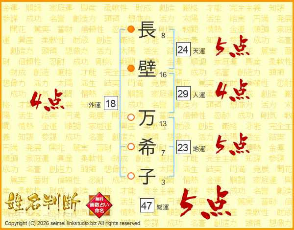 長(8画)壁(16画) 万(13画)希(7画)子(3画)