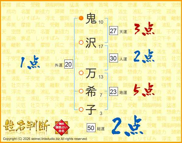 鬼沢万希子さんの総運は50画の2点!