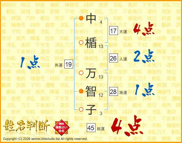 中(4画)楯(13画) 万(13画)智(12画)子(3画)