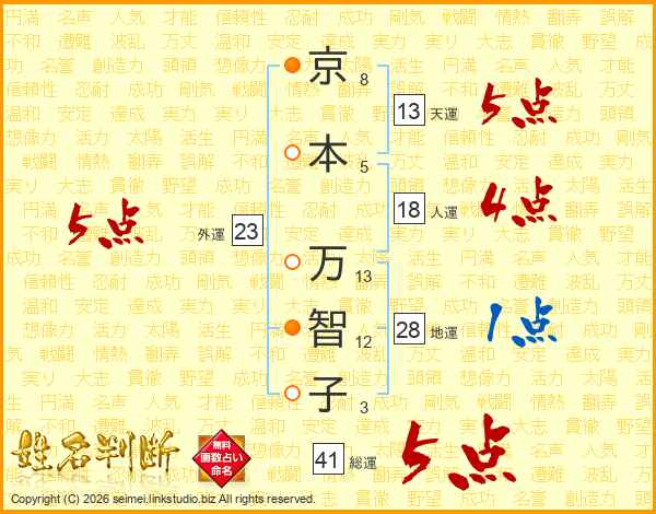京(8画)本(5画) 万(13画)智(12画)子(3画)