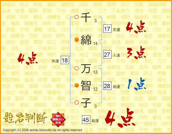 千(3画)綿(14画) 万(13画)智(12画)子(3画)