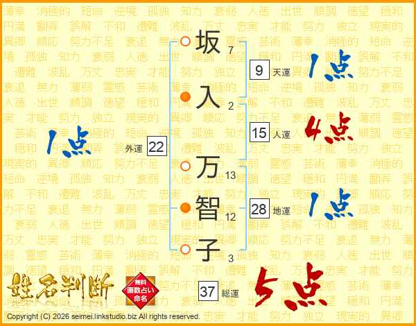坂(7画)入(2画) 万(13画)智(12画)子(3画)