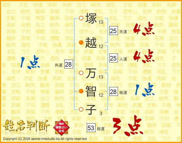 塚(13画)越(12画) 万(13画)智(12画)子(3画)