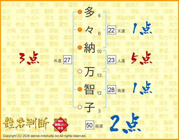 多(6画)々(6画)納(10画) 万(13画)智(12画)子(3画)