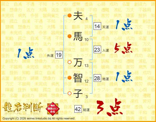 夫(4画)馬(10画) 万(13画)智(12画)子(3画)