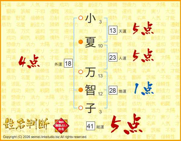 小(3画)夏(10画) 万(13画)智(12画)子(3画)