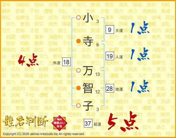 小(3画)寺(6画) 万(13画)智(12画)子(3画)
