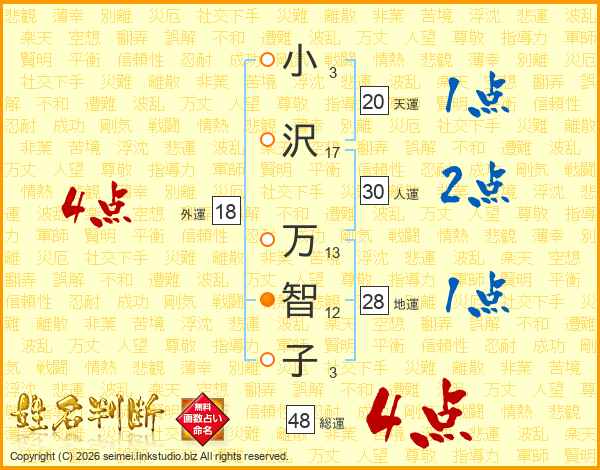 小(3画)沢(17画) 万(13画)智(12画)子(3画)