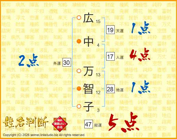 広(15画)中(4画) 万(13画)智(12画)子(3画)