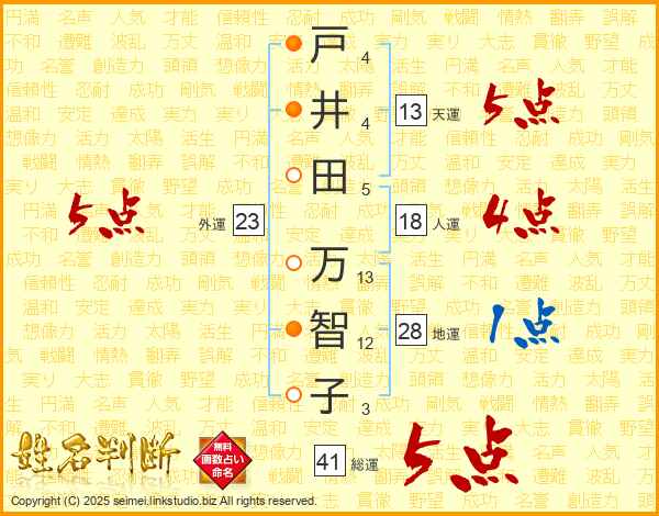 戸(4画)井(4画)田(5画) 万(13画)智(12画)子(3画)