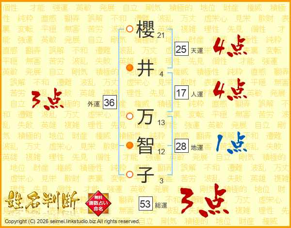 櫻(21画)井(4画) 万(13画)智(12画)子(3画)