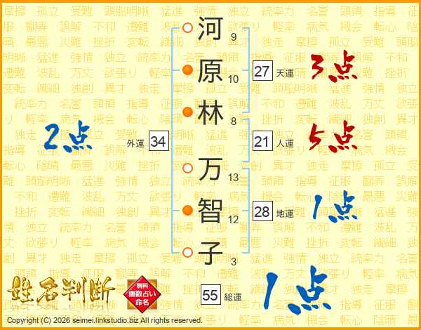 河(9画)原(10画)林(8画) 万(13画)智(12画)子(3画)