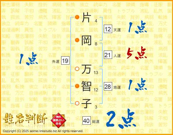 片(4画)岡(8画) 万(13画)智(12画)子(3画)