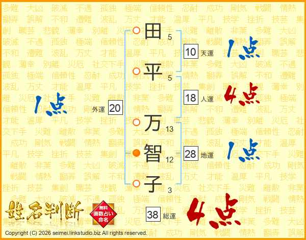 田(5画)平(5画) 万(13画)智(12画)子(3画)