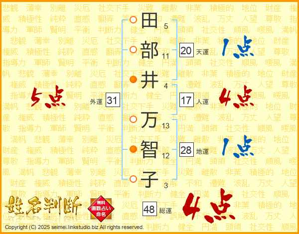 田(5画)部(11画)井(4画) 万(13画)智(12画)子(3画)