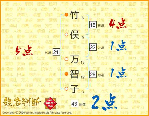 竹(6画)俣(9画) 万(13画)智(12画)子(3画)