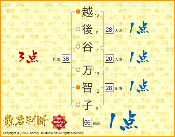 越(12画)後(9画)谷(7画) 万(13画)智(12画)子(3画)