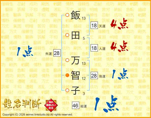 飯(13画)田(5画) 万(13画)智(12画)子(3画)