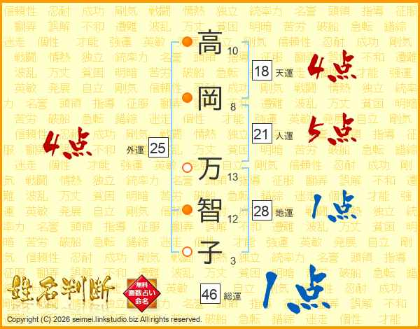 高(10画)岡(8画) 万(13画)智(12画)子(3画)
