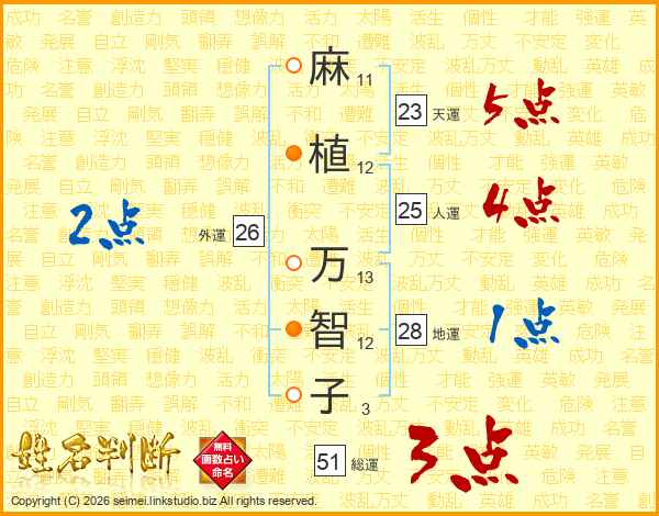 麻(11画)植(12画) 万(13画)智(12画)子(3画)