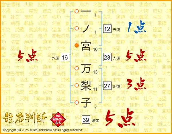 一(1画)ノ(1画)宮(10画) 万(13画)梨(11画)子(3画)