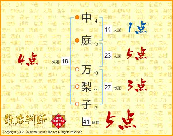 生活面を象徴する運勢です。外部から受ける影響力を表し、結婚運、家庭運や職場、環境への順応性を表します。総運から人運を引いた画数。姓や名が1文字の場合を除く。