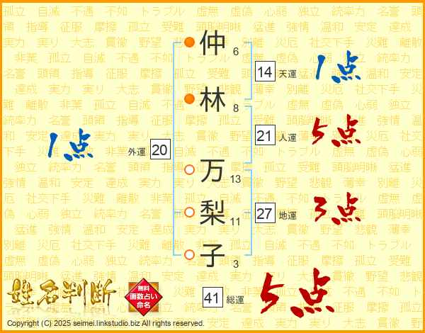 仲(6画)林(8画) 万(13画)梨(11画)子(3画)