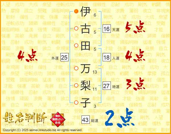 伊(6画)古(5画)田(5画) 万(13画)梨(11画)子(3画)