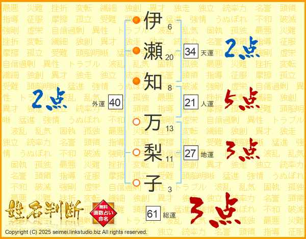 伊(6画)瀬(20画)知(8画) 万(13画)梨(11画)子(3画)