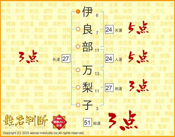 伊(6画)良(7画)部(11画) 万(13画)梨(11画)子(3画)