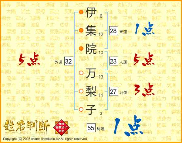 伊(6画)集(12画)院(10画) 万(13画)梨(11画)子(3画)