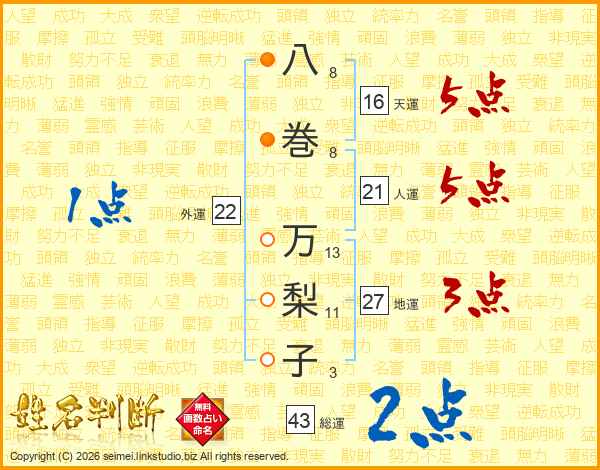 八(8画)巻(8画) 万(13画)梨(11画)子(3画)