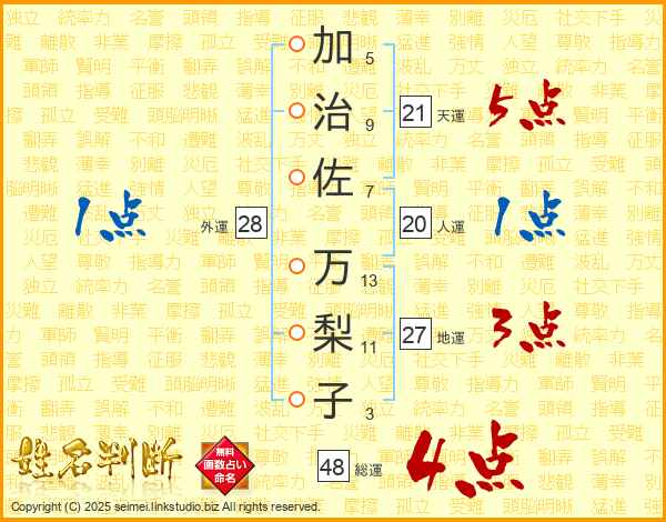 加(5画)治(9画)佐(7画) 万(13画)梨(11画)子(3画)