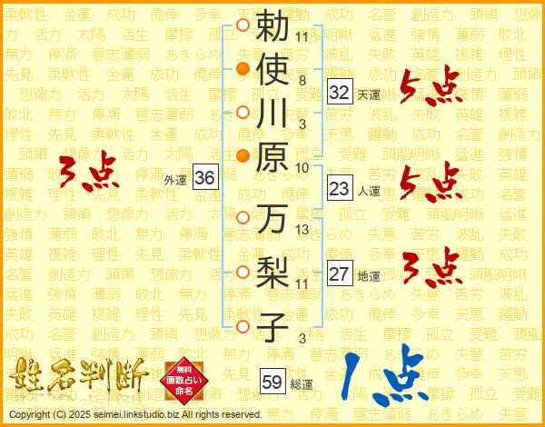 勅(11画)使(8画)川(3画)原(10画) 万(13画)梨(11画)子(3画)