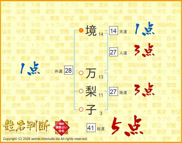 境(14画) 万(13画)梨(11画)子(3画)