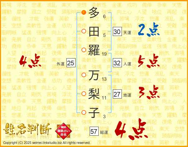 多(6画)田(5画)羅(19画) 万(13画)梨(11画)子(3画)