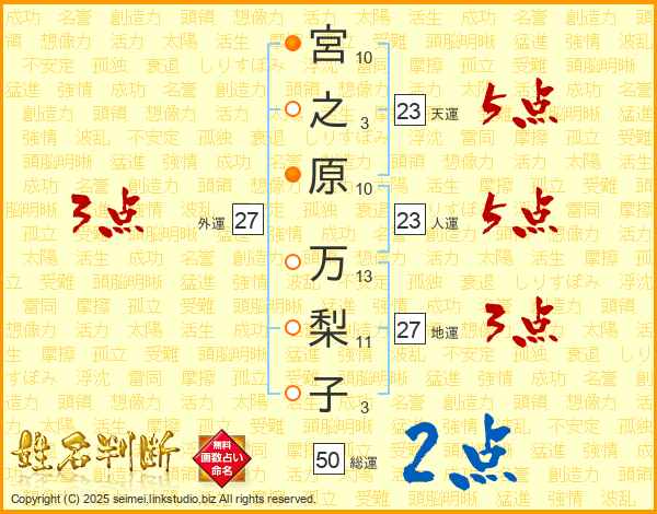 宮(10画)之(3画)原(10画) 万(13画)梨(11画)子(3画)