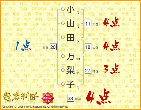 小(3画)山(3画)田(5画) 万(13画)梨(11画)子(3画)