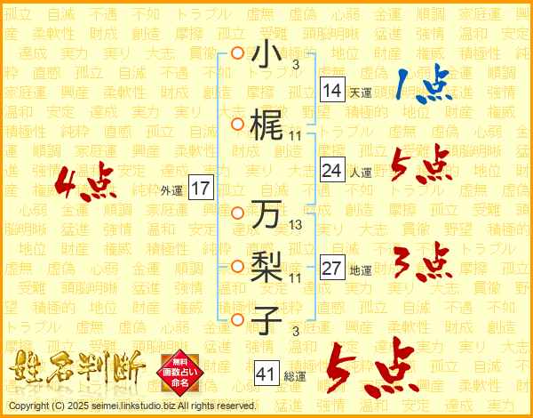 小(3画)梶(11画) 万(13画)梨(11画)子(3画)